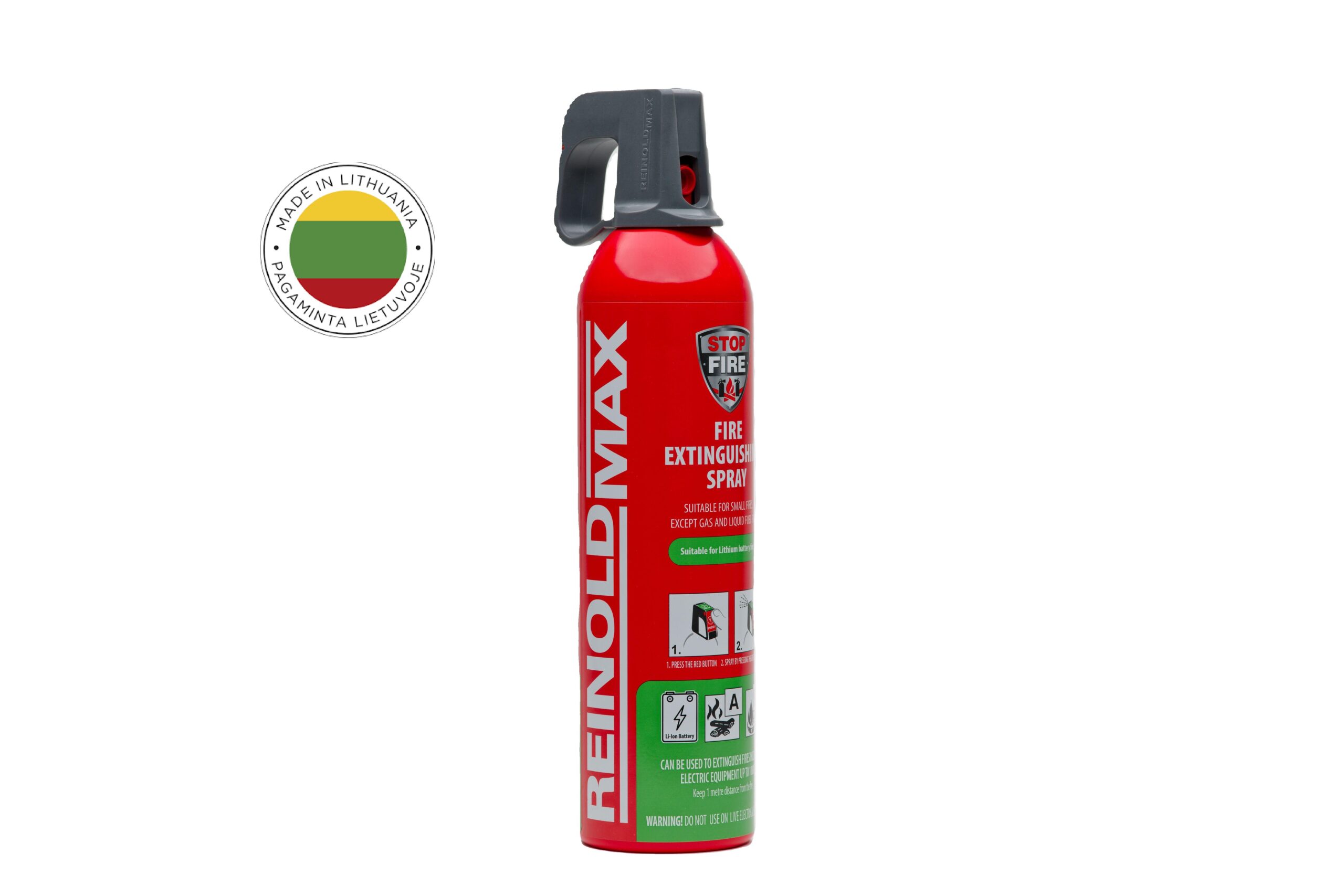 At the very beginning, we recommend using a unique fire extinguishing spray ReinoldMax 750 ml. It is an effective aerosol product that, when sprayed onto a fire source, instantly forms a cooling water-based film (AFFF) that lowers the temperature of the fire source and prevents re-ignition.